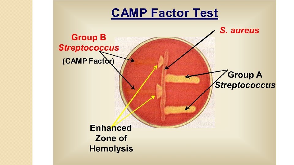 Identification of group B streptococci. (S. agalactiae) The CAMP Test The laboratory identification of Group B hemolytic streptococci has been simplified by implementation of the CAMP test which is easy to perform and well within the capabilities of small laboratories. The hemolytic activity of staphylococcal-hemolysin on RBC is enhanced by an extracellular factor produced by Group B streptococci, called the CAMP factor. Therefore, wherever the two reactants overlap in sheep BAP, an accentuation of the ß-hemolytic reaction will be noted.