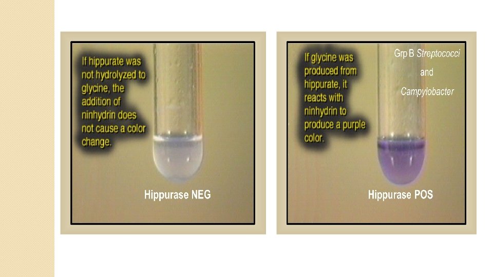 Procedure: 1. To a Hippurate Test tube, add 0. 2 ml (3 -4 drops) of distilled water at a p. H of 6. 8 -7. 2. 2. Using a heavy inoculum (a full 10 ul loop is adequate) from an 18 -24 hour culture, make a heavy suspension of the organism in the Hippurate Reagent with a standard inoculating loop. 3. Incubate the tube for two hours at 35 -37 degrees C. 4. During the incubation period, reconstitute the Ninhydrin Indicator Solution in the dropper bottle by adding 2 ml of distilled water at a p. H of 6. 8 -7. 2. Replace the cap tip and cap, and vigorously shake for one minute. Let stand at room temperature for 30 minutes or until all the substrate has dissolved. 5. After the two hour incubation period, add two drops of the Ninhydrin Indicator Solution to the Hippurate Reagent and organism mixture. 6. Reincubate at 35 -37 degrees C. for 30 minutes. Observe the tubes at 10 minute intervals for the appearance of a deep blue color, which is a positive test. The color change will usually appear in 10 to 15 minutes after the Ninhydrin Indicator Solution has been added.