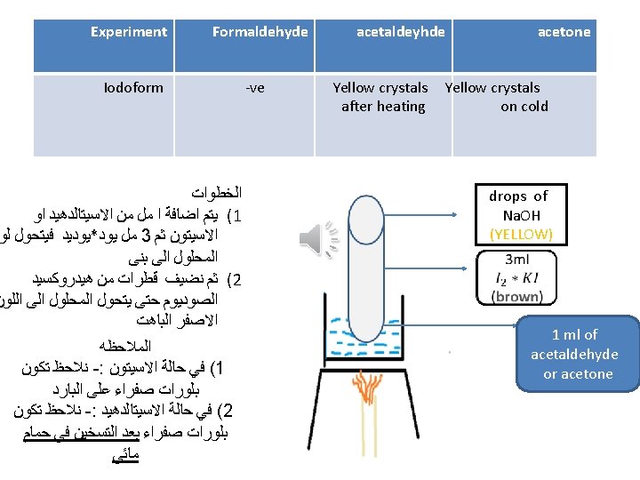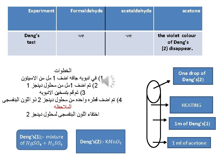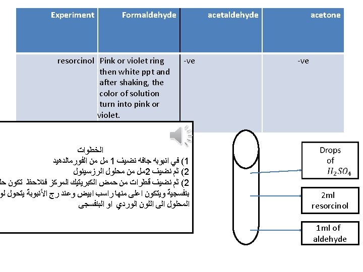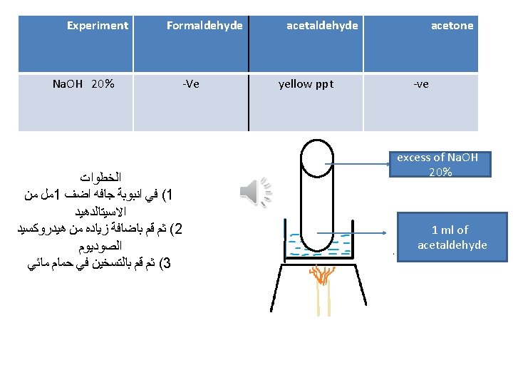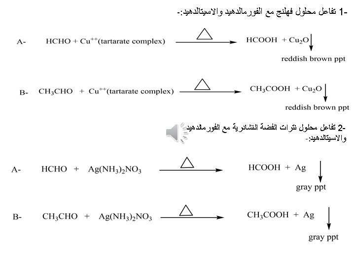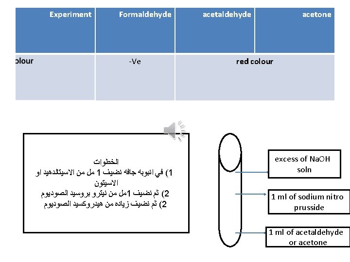 Experiment Formaldehyde Fehling test acetaldehyde Reddish brown ppt acetone -ve 1 ml fehling (B) 1 ml fehling( A) Fehling ( B) : - sodium potassium tartrate 1 ml of aldehyde