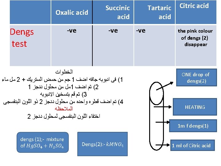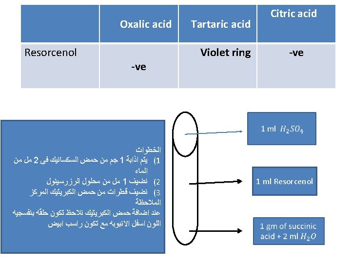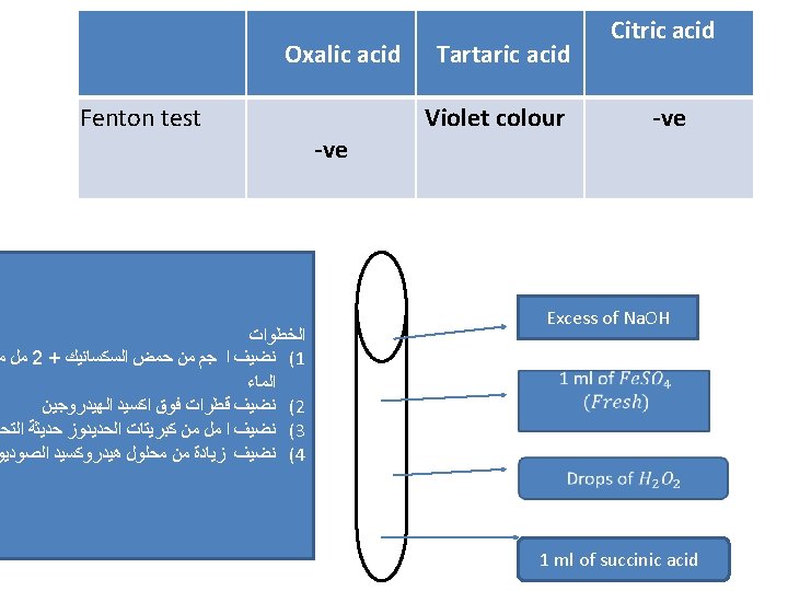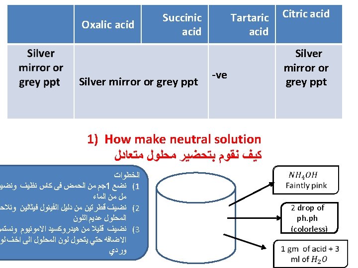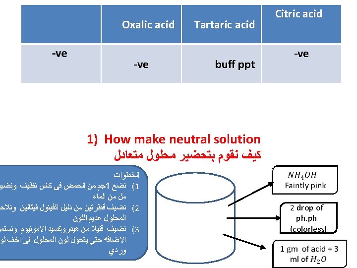 Oxalic acid White ppt at once Tartaric acid White ppt after shacking Citric acid White ppt after boiling ﺑﻌﺪ ﻋﻤﻞ ﺍﻟﻤﺤﻠﻮﻝ ﺍﻟﻤﺘﻌﺎﺩﻝ ﻛﻤﺎ ﺳﺒﻖ ﺷﺮﺣﻪ ﻧﻘﻮﻡ ﺑﺎﻟﺨﻄﻮﺍﺕ ﺍﻟﺘﺎﻟﻴﻪ 1 ml of neutral solution