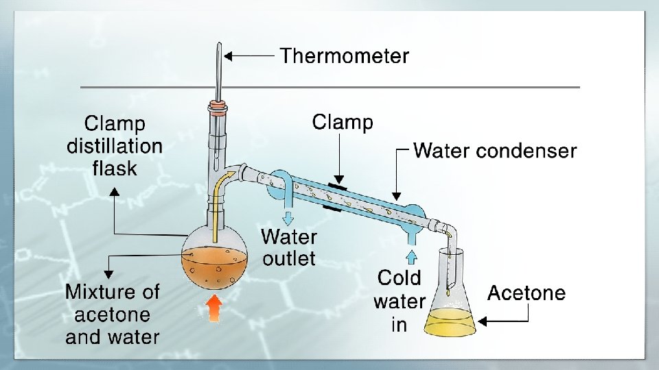 Distillation: (Purification technique) is a process of separating the component or substances from a liquid mixture by evaporation and condensation or to purify an impure liquid. To separate a mixture of liquids, the liquid can be heated to force components, which have different boiling points. Although the term is most commonly applied to liquids, the reverse process can be used to separate gases by liquefying components using changes in temperature and/or pressure.