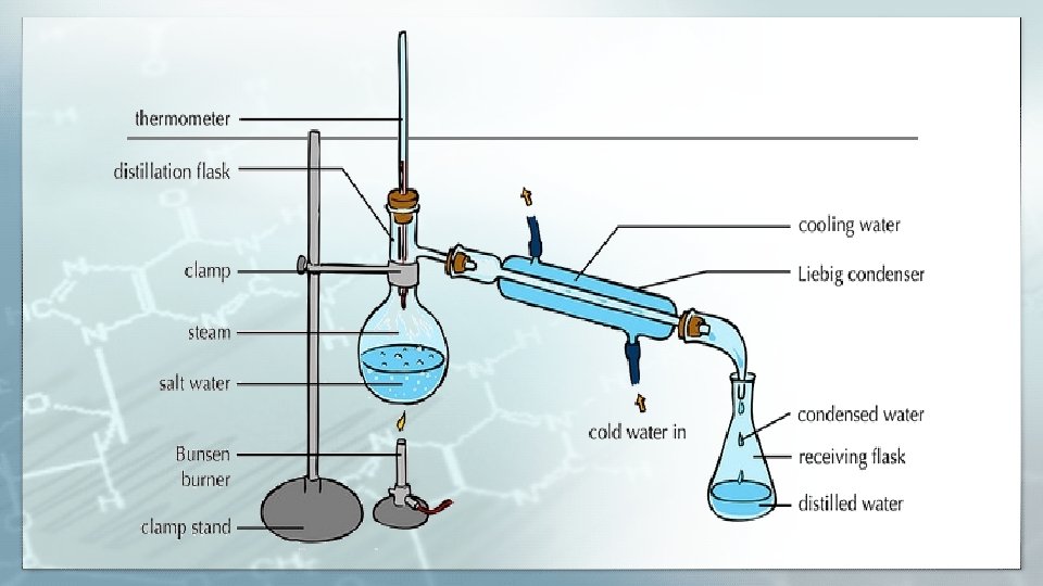 Principle of Distillation ? Distillation involves the conversion of a liquid to its vapor upon heating, then cooling the vapor by (Liebig Condenser) to condense and collecting it into the flask.