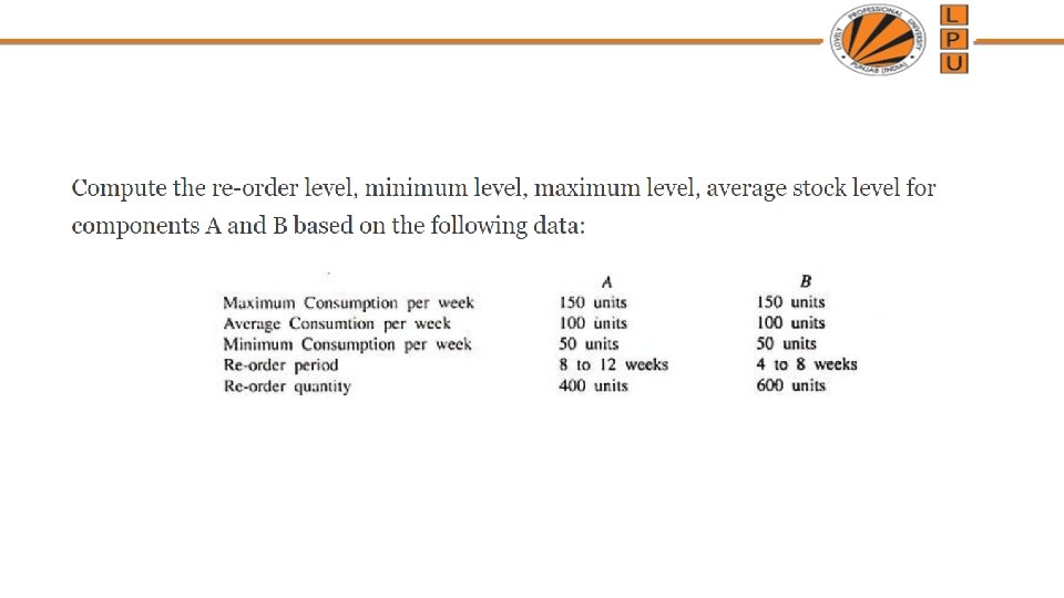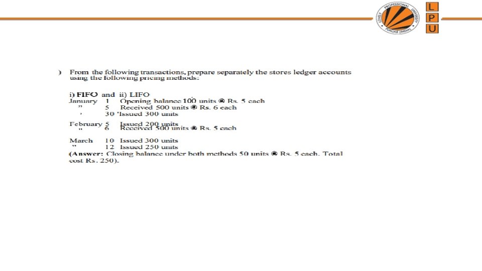• Example: • In a factory, stores are issued and accounted for on FIFO method. If the stock of a particular material on 1 st Jan. 1992 is 1, 000 units valued at Rs. 5 per unit and the particulars of purchases and issues during the month of Jan. 1992 are as follows, prepare a statement showing how the value of issues should be arrived at: