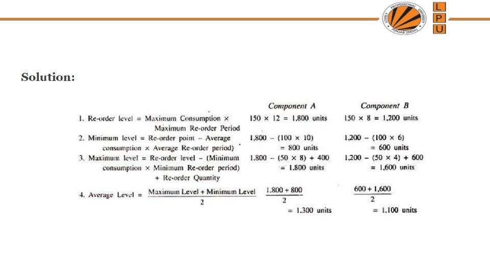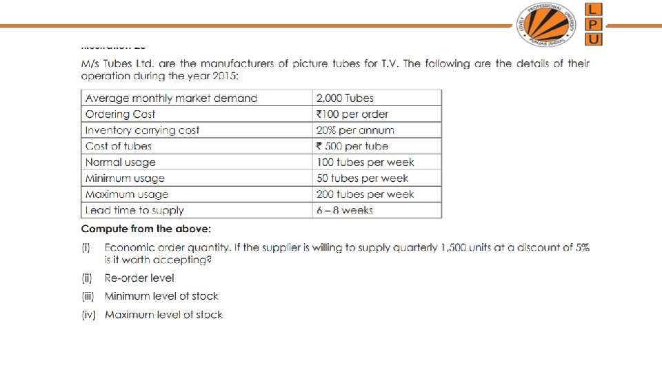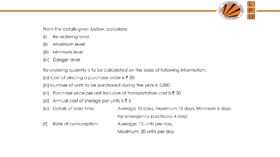 • Demand = 1000 items per month Holding Cost = 15% of product cost Ordering Cost = 300 per order Product Cost = 60 per unit • Calculate EOQ and Reorder level