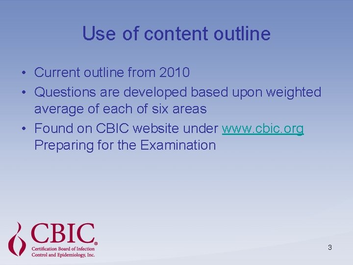 Objectives • Explain how to use the content outline as part of exam preparations • Understand the role of the practice analysis in determining exam content and eligibility • Describe three types of exam questions and apply practical strategies for each category. 2
