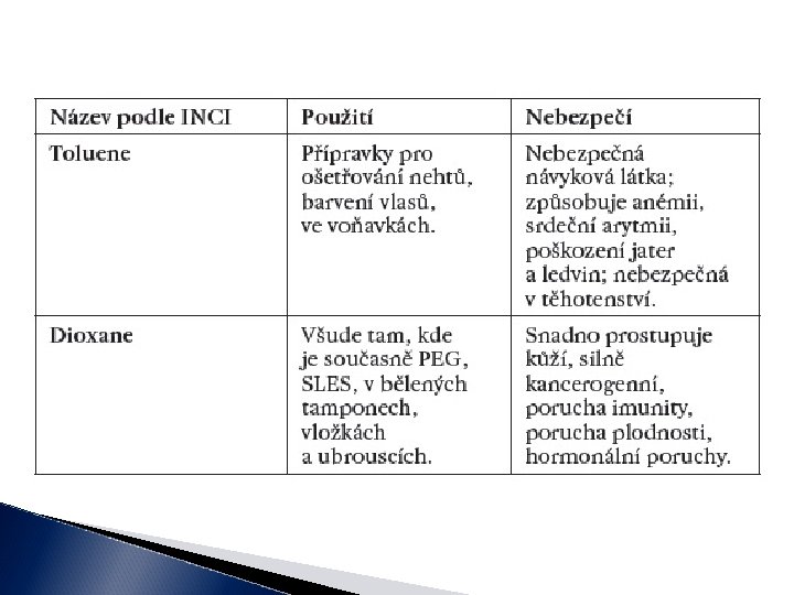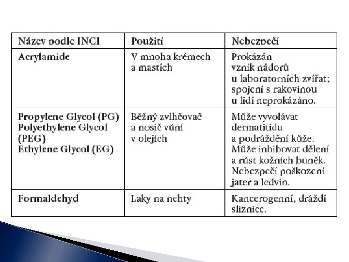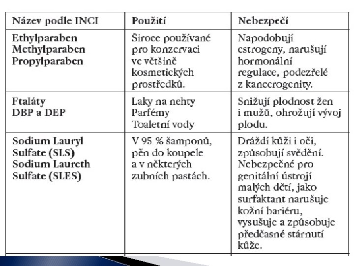 Přísady v kosmetice Pro kosmetické produkty platí povinnost uvádět jejich složení ve formě mezinárodního názvosloví INCI. vyhláška 448/2009/7 Sb. o stanovení hygienických požadavků na kosmetické prostředky Seznam látek, které nesmějí být součástí složení kosmetických prostředků, obsahuje 1371 položek!