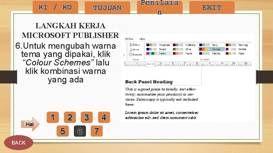 KI / KD TUJUAN LANGKAH KERJA MICROSOFT PUBLISHER 6. Untuk mengubah warna tema yang dipakai, klik “Colour Schemes” lalu klik kombinasi warna yang ada Hal BACK 1 2 5 3 6 4 7 Penilaia n EXIT