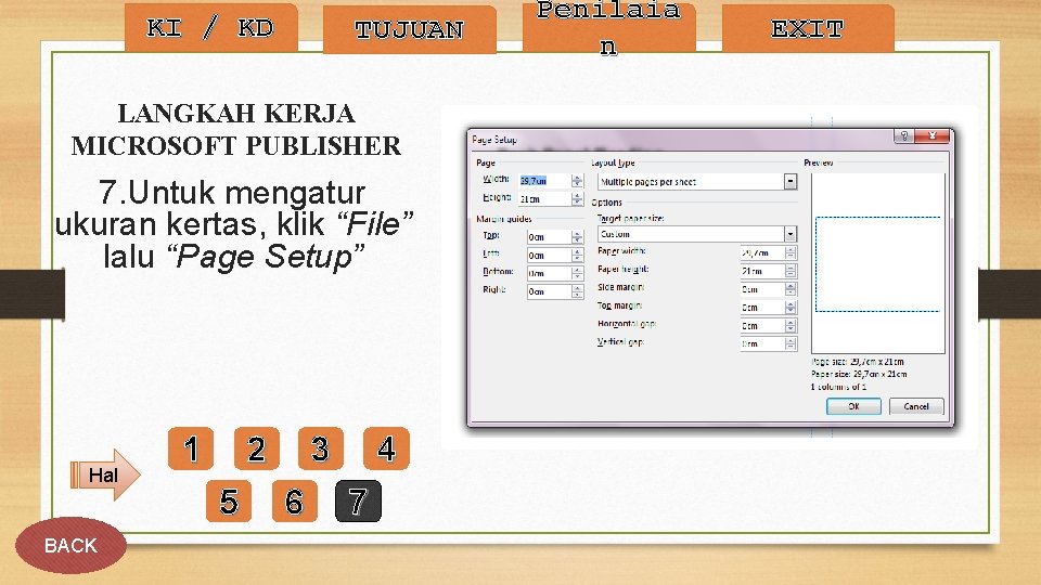 KI / KD TUJUAN LANGKAH KERJA MICROSOFT PUBLISHER 7. Untuk mengatur ukuran kertas, klik “File” lalu “Page Setup” Hal BACK 1 2 5 3 6 4 7 Penilaia n EXIT