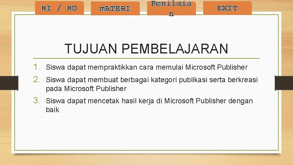 TUJUAN m. ATERI Penilaia n EXIT KOMPETENSI INTI & KOMPETENSI DASAR • KI 3: Memahami dan menerapkan pengetahuan faktual, konseptual, prosedural dalam ilmu pengetahuan, teknologi, seni, budaya, dan humaniora dengan wawasan kemanusiaan, kebangsaan, kenegaraan, dan peradaban terkait fenomena dan kejadian, serta menerapkan pengetahuan prosedural pada bidang kajian yang spesifik sesuai dengan bakat dan minatnya untuk memecahkan masalah. • KI 4: Mengolah, menalar, dan menyaji dalam ranah konkret dan ranah abstrak terkait dengan pengembangan dari yang dipelajarinya di sekolah secara mandiri, dan mampu menggunakan metoda sesuai kaidah keilmuan. • 4. 5 Mempraktikkan cara mengoperasikan Microsoft Publisher