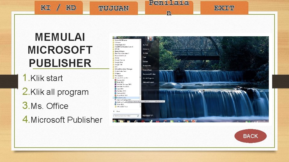 KI / KD TUJUAN Penilaia n EXIT MEMULAI MICROSOFT PUBLISHER 1. Klik start 2. Klik all program 3. Ms. Office 4. Microsoft Publisher BACK