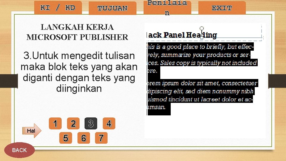 KI / KD TUJUAN LANGKAH KERJA MICROSOFT PUBLISHER 3. Untuk mengedit tulisan maka blok teks yang akan diganti dengan teks yang diinginkan Hal BACK 1 2 5 3 6 4 7 Penilaia n EXIT