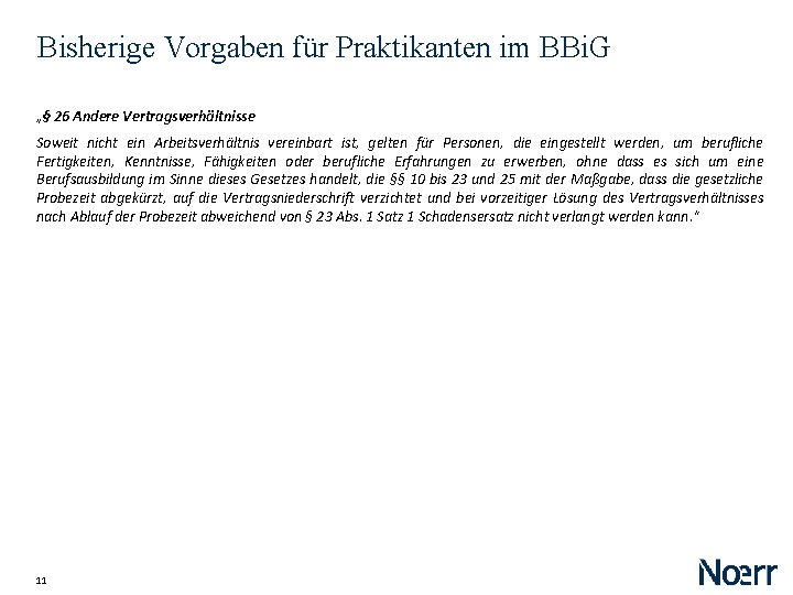 Bisherige Vorgaben für Praktikanten im BBi. G „§ 26 Andere Vertragsverhältnisse Soweit nicht ein Arbeitsverhältnis vereinbart ist, gelten für Personen, die eingestellt werden, um berufliche Fertigkeiten, Kenntnisse, Fähigkeiten oder berufliche Erfahrungen zu erwerben, ohne dass es sich um eine Berufsausbildung im Sinne dieses Gesetzes handelt, die §§ 10 bis 23 und 25 mit der Maßgabe, dass die gesetzliche Probezeit abgekürzt, auf die Vertragsniederschrift verzichtet und bei vorzeitiger Lösung des Vertragsverhältnisses nach Ablauf der Probezeit abweichend von § 23 Abs. 1 Satz 1 Schadensersatz nicht verlangt werden kann. “ 11