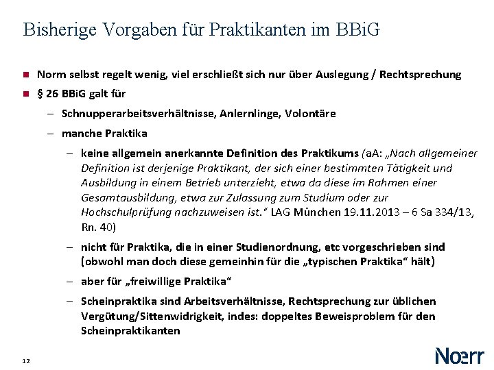 Bisherige Vorgaben für Praktikanten im BBi. G Norm selbst regelt wenig, viel erschließt sich nur über Auslegung / Rechtsprechung § 26 BBi. G galt für ‒ Schnupperarbeitsverhältnisse, Anlernlinge, Volontäre ‒ manche Praktika ‒ keine allgemein anerkannte Definition des Praktikums (a. A: „Nach allgemeiner Definition ist derjenige Praktikant, der sich einer bestimmten Tätigkeit und Ausbildung in einem Betrieb unterzieht, etwa da diese im Rahmen einer Gesamtausbildung, etwa zur Zulassung zum Studium oder zur Hochschulprüfung nachzuweisen ist. “ LAG München 19. 11. 2013 – 6 Sa 334/13, Rn. 40) ‒ nicht für Praktika, die in einer Studienordnung, etc vorgeschrieben sind (obwohl man doch diese gemeinhin für die „typischen Praktika“ hält) ‒ aber für „freiwillige Praktika“ ‒ Scheinpraktika sind Arbeitsverhältnisse, Rechtsprechung zur üblichen Vergütung/Sittenwidrigkeit, indes: doppeltes Beweisproblem für den Scheinpraktikanten 12