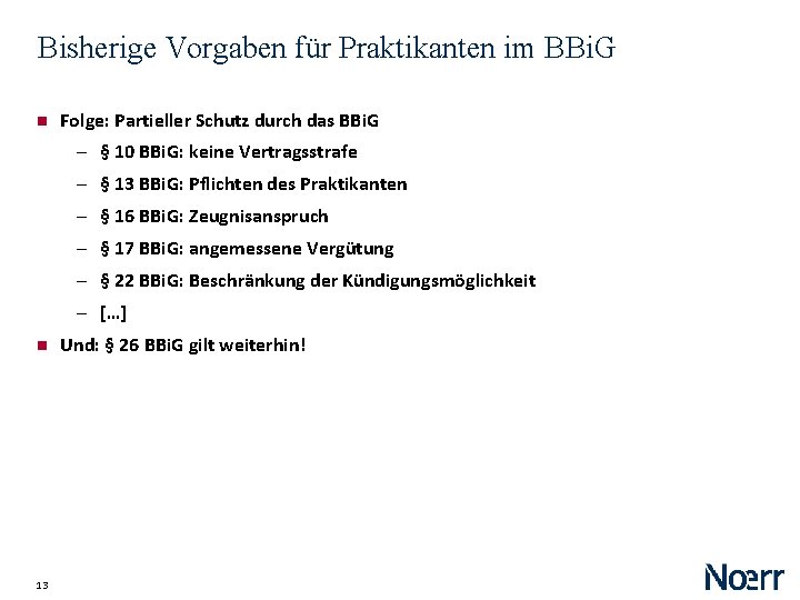 Bisherige Vorgaben für Praktikanten im BBi. G Folge: Partieller Schutz durch das BBi. G ‒ § 10 BBi. G: keine Vertragsstrafe ‒ § 13 BBi. G: Pflichten des Praktikanten ‒ § 16 BBi. G: Zeugnisanspruch ‒ § 17 BBi. G: angemessene Vergütung ‒ § 22 BBi. G: Beschränkung der Kündigungsmöglichkeit ‒ […] 13 Und: § 26 BBi. G gilt weiterhin!