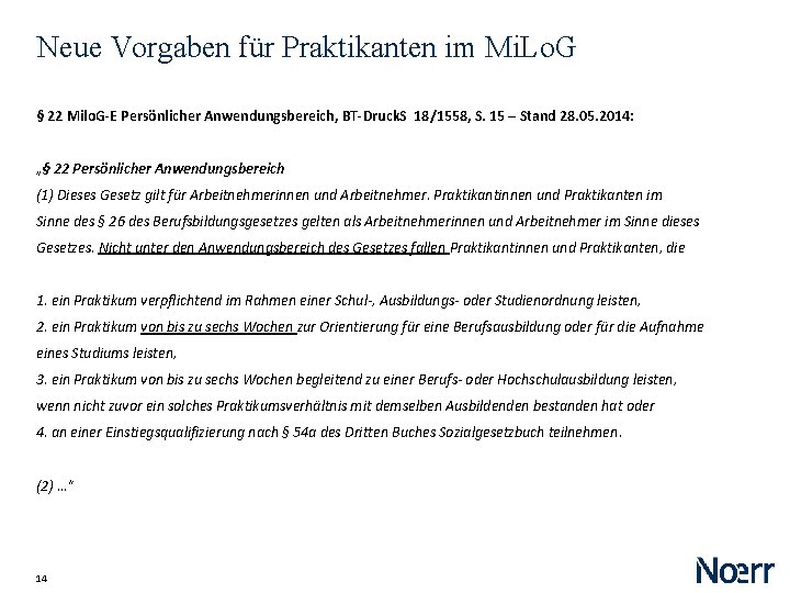 Neue Vorgaben für Praktikanten im Mi. Lo. G § 22 Milo. G-E Persönlicher Anwendungsbereich, BT-Druck. S 18/1558, S. 15 – Stand 28. 05. 2014: „§ 22 Persönlicher Anwendungsbereich (1) Dieses Gesetz gilt für Arbeitnehmerinnen und Arbeitnehmer. Praktikantinnen und Praktikanten im Sinne des § 26 des Berufsbildungsgesetzes gelten als Arbeitnehmerinnen und Arbeitnehmer im Sinne dieses Gesetzes. Nicht unter den Anwendungsbereich des Gesetzes fallen Praktikantinnen und Praktikanten, die 1. ein Praktikum verpflichtend im Rahmen einer Schul-, Ausbildungs- oder Studienordnung leisten, 2. ein Praktikum von bis zu sechs Wochen zur Orientierung für eine Berufsausbildung oder für die Aufnahme eines Studiums leisten, 3. ein Praktikum von bis zu sechs Wochen begleitend zu einer Berufs- oder Hochschulausbildung leisten, wenn nicht zuvor ein solches Praktikumsverhältnis mit demselben Ausbildenden bestanden hat oder 4. an einer Einstiegsqualifizierung nach § 54 a des Dritten Buches Sozialgesetzbuch teilnehmen. (2) …“ 14