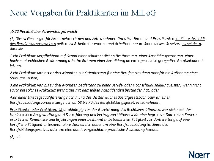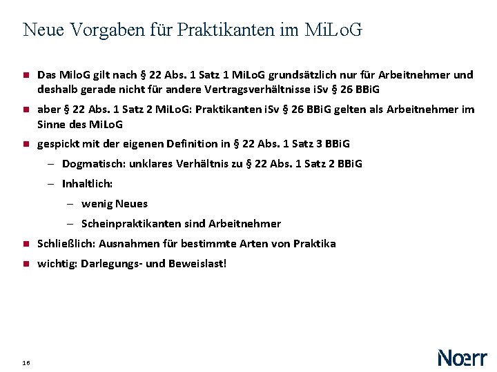 Neue Vorgaben für Praktikanten im Mi. Lo. G „§ 22 Persönlicher Anwendungsbereich (1) Dieses Gesetz gilt für Arbeitnehmerinnen und Arbeitnehmer. Praktikantinnen und Praktikanten im Sinne des § 26 des Berufsbildungsgesetzes gelten als Arbeitnehmerinnen und Arbeitnehmer im Sinne dieses Gesetzes, es sei denn, dass sie 1. ein Praktikum verpflichtend auf Grund einer schulrechtlichen Bestimmung, einer Ausbildungsordnung, einer hochschulrechtlichen Bestimmung oder im Rahmen einer Ausbildung an einer gesetzlich geregelten Berufsakademie leisten, 2. ein Praktikum von bis zu drei Monaten zur Orientierung für eine Berufsausbildung oder für die Aufnahme eines Studiums leisten, 3. ein Praktikum von bis zu drei Monaten begleitend zu einer Berufs- oder Hochschulausbildung leisten, wenn nicht zuvor ein solches Praktikumsverhältnis mit demselben Ausbildenden bestanden hat, oder 4. an einer Einstiegsqualifizierung nach § 54 a des Dritten Buches Sozialgesetzbuch oder an einer Berufsausbildungsvorbereitung nach §§ 68 bis 70 des Berufsbildungsgesetzes teilnehmen. Praktikantin oder Praktikant ist unabhängig von der Bezeichnung des Rechtsverhältnisses, wer sich nach der tatsächlichen Ausgestaltung und Durchführung des Vertragsverhältnisses für eine begrenzte Dauer zum Erwerb praktischer Kenntnisse und Erfahrungen einer bestimmten betrieblichen Tätigkeit zur Vorbereitung auf eine berufliche Tätigkeit unterzieht, ohne dass es sich dabei um eine Berufsausbildung im Sinne des Berufsbildungsgesetzes oder um eine damit vergleichbare praktische Ausbildung handelt. (2) …“ 15