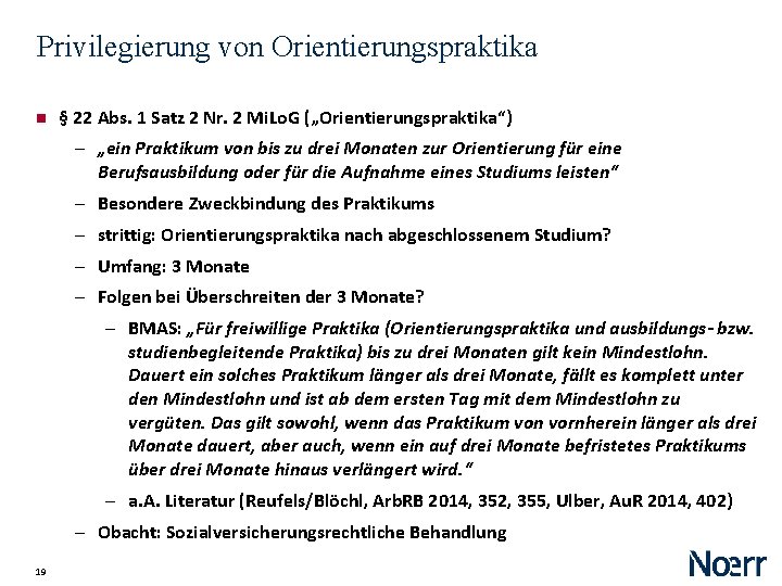 Privilegierung von Pflichtpraktika § 22 Abs. 1 Satz 2 Nr. 1 Mi. Lo. G („Pflichtpraktika“) ‒ „ein Praktikum verpflichtend auf Grund einer schulrechtlichen Bestimmung, einer Ausbildungsordnung, einer hochschulrechtlichen Bestimmung oder im Rahmen einer Ausbildung an einer gesetzlich geregelten Berufsakademie leisten“ ‒ Dogmatisch zweifelhaft: ‒ echte Praktikanten hingegen wären auch ohne die Ausnahme des Nr. 1 vom Mi. Lo. G ausgenommen, weil sie keine Praktikanten des § 26 BBi. G sind („deklaratorisch“: Reufels/Blöchl, Arb. RB 2014, 352, 354) ‒ oder aber: Erweiterung der Auslegung des § 26 BBi. G? Folge: Schutz auch solcher Praktikanten durch das BBi. G, insbesondere durch § 17 BBi. G (angemessene Vergütung)… ‒ Exmatrikulation / Aufgabe des Studienwunsches während des Praktikums ‒ Unbegrenzter zeitlicher Umfang des Pflichtpraktikums ‒ Ausländische Studienordnungen ‒ Praktische Probleme bei der Durchführung (hierzu sogleich) 18