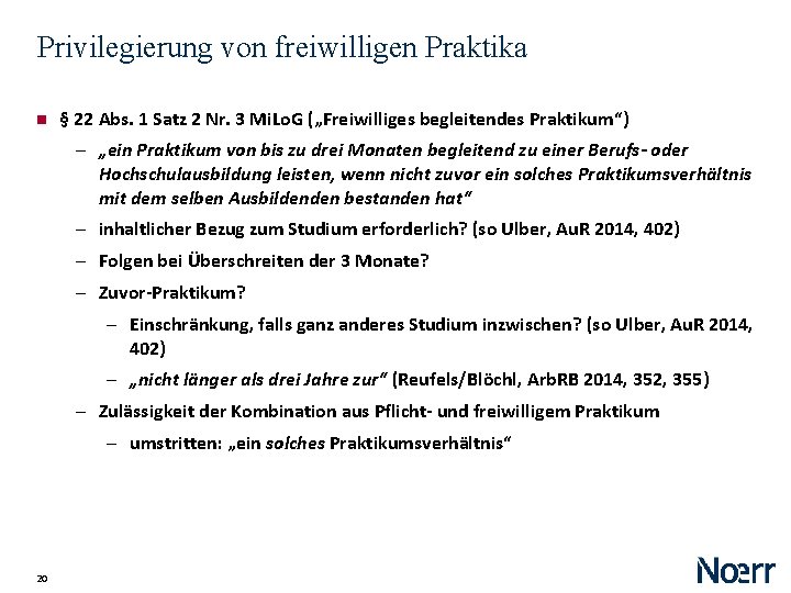 Privilegierung von Orientierungspraktika § 22 Abs. 1 Satz 2 Nr. 2 Mi. Lo. G („Orientierungspraktika“) ‒ „ein Praktikum von bis zu drei Monaten zur Orientierung für eine Berufsausbildung oder für die Aufnahme eines Studiums leisten“ ‒ Besondere Zweckbindung des Praktikums ‒ strittig: Orientierungspraktika nach abgeschlossenem Studium? ‒ Umfang: 3 Monate ‒ Folgen bei Überschreiten der 3 Monate? ‒ BMAS: „Für freiwillige Praktika (Orientierungspraktika und ausbildungs- bzw. studienbegleitende Praktika) bis zu drei Monaten gilt kein Mindestlohn. Dauert ein solches Praktikum länger als drei Monate, fällt es komplett unter den Mindestlohn und ist ab dem ersten Tag mit dem Mindestlohn zu vergüten. Das gilt sowohl, wenn das Praktikum von vornherein länger als drei Monate dauert, aber auch, wenn ein auf drei Monate befristetes Praktikums über drei Monate hinaus verlängert wird. “ ‒ a. A. Literatur (Reufels/Blöchl, Arb. RB 2014, 352, 355, Ulber, Au. R 2014, 402) ‒ Obacht: Sozialversicherungsrechtliche Behandlung 19