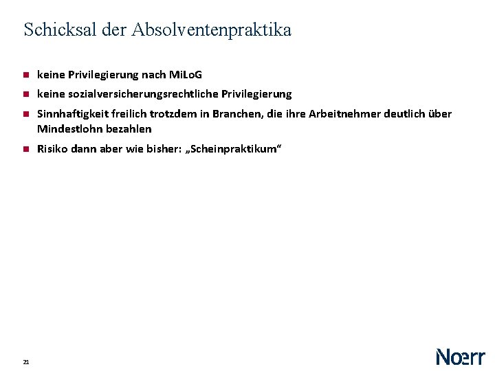 Privilegierung von freiwilligen Praktika § 22 Abs. 1 Satz 2 Nr. 3 Mi. Lo. G („Freiwilliges begleitendes Praktikum“) ‒ „ein Praktikum von bis zu drei Monaten begleitend zu einer Berufs- oder Hochschulausbildung leisten, wenn nicht zuvor ein solches Praktikumsverhältnis mit dem selben Ausbildenden bestanden hat“ ‒ inhaltlicher Bezug zum Studium erforderlich? (so Ulber, Au. R 2014, 402) ‒ Folgen bei Überschreiten der 3 Monate? ‒ Zuvor-Praktikum? ‒ Einschränkung, falls ganz anderes Studium inzwischen? (so Ulber, Au. R 2014, 402) ‒ „nicht länger als drei Jahre zur“ (Reufels/Blöchl, Arb. RB 2014, 352, 355) ‒ Zulässigkeit der Kombination aus Pflicht- und freiwilligem Praktikum ‒ umstritten: „ein solches Praktikumsverhältnis“ 20