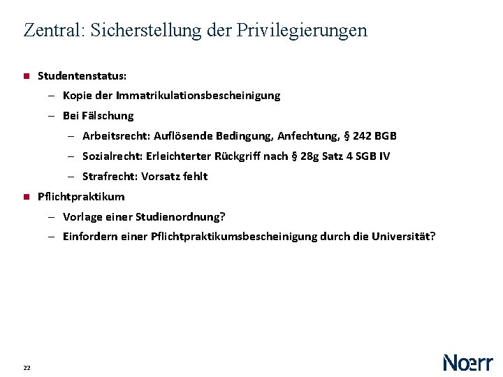 Zentral: Sicherstellung der Privilegierungen Studentenstatus: ‒ Kopie der Immatrikulationsbescheinigung ‒ Bei Fälschung ‒ Arbeitsrecht: Auflösende Bedingung, Anfechtung, § 242 BGB ‒ Sozialrecht: Erleichterter Rückgriff nach § 28 g Satz 4 SGB IV ‒ Strafrecht: Vorsatz fehlt Pflichtpraktikum ‒ Vorlage einer Studienordnung? ‒ Einfordern einer Pflichtpraktikumsbescheinigung durch die Universität? 22