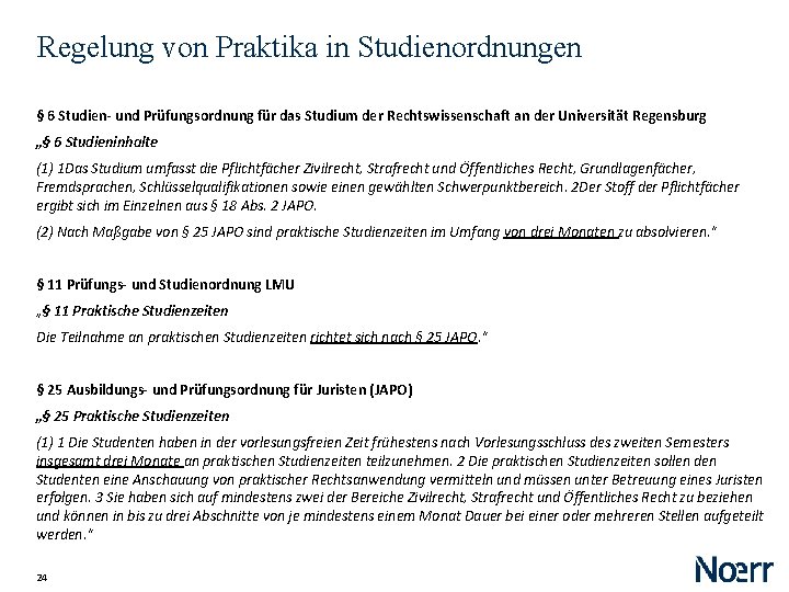 Regelung von Praktika in Studienordnungen § 6 Studien- und Prüfungsordnung für das Studium der Rechtswissenschaft an der Universität Regensburg „§ 6 Studieninhalte (1) 1 Das Studium umfasst die Pflichtfächer Zivilrecht, Strafrecht und Öffentliches Recht, Grundlagenfächer, Fremdsprachen, Schlüsselqualifikationen sowie einen gewählten Schwerpunktbereich. 2 Der Stoff der Pflichtfächer ergibt sich im Einzelnen aus § 18 Abs. 2 JAPO. (2) Nach Maßgabe von § 25 JAPO sind praktische Studienzeiten im Umfang von drei Monaten zu absolvieren. “ § 11 Prüfungs- und Studienordnung LMU „§ 11 Praktische Studienzeiten Die Teilnahme an praktischen Studienzeiten richtet sich nach § 25 JAPO. “ § 25 Ausbildungs- und Prüfungsordnung für Juristen (JAPO) „§ 25 Praktische Studienzeiten (1) 1 Die Studenten haben in der vorlesungsfreien Zeit frühestens nach Vorlesungsschluss des zweiten Semesters insgesamt drei Monate an praktischen Studienzeiten teilzunehmen. 2 Die praktischen Studienzeiten sollen den Studenten eine Anschauung von praktischer Rechtsanwendung vermitteln und müssen unter Betreuung eines Juristen erfolgen. 3 Sie haben sich auf mindestens zwei der Bereiche Zivilrecht, Strafrecht und Öffentliches Recht zu beziehen und können in bis zu drei Abschnitte von je mindestens einem Monat Dauer bei einer oder mehreren Stellen aufgeteilt werden. “ 24