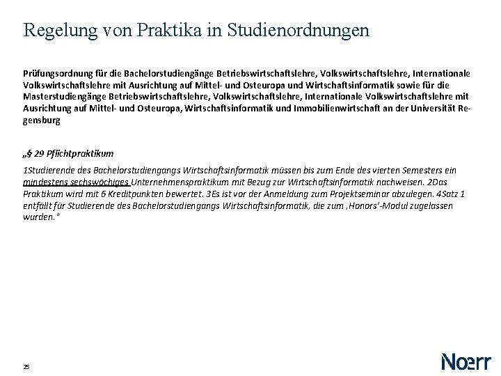 Regelung von Praktika in Studienordnungen Prüfungsordnung für die Bachelorstudiengänge Betriebswirtschaftslehre, Volkswirtschaftslehre, Internationale Volkswirtschaftslehre mit Ausrichtung auf Mittel- und Osteuropa und Wirtschaftsinformatik sowie für die Masterstudiengänge Betriebswirtschaftslehre, Volkswirtschaftslehre, Internationale Volkswirtschaftslehre mit Ausrichtung auf Mittel- und Osteuropa, Wirtschaftsinformatik und Immobilienwirtschaft an der Universität Regensburg „§ 29 Pflichtpraktikum 1 Studierende des Bachelorstudiengangs Wirtschaftsinformatik müssen bis zum Ende des vierten Semesters ein mindestens sechswöchiges Unternehmenspraktikum mit Bezug zur Wirtschaftsinformatik nachweisen. 2 Das Praktikum wird mit 6 Kreditpunkten bewertet. 3 Es ist vor der Anmeldung zum Projektseminar abzulegen. 4 Satz 1 entfällt für Studierende des Bachelorstudiengangs Wirtschaftsinformatik, die zum ‚Honors‘-Modul zugelassen wurden. “ 25