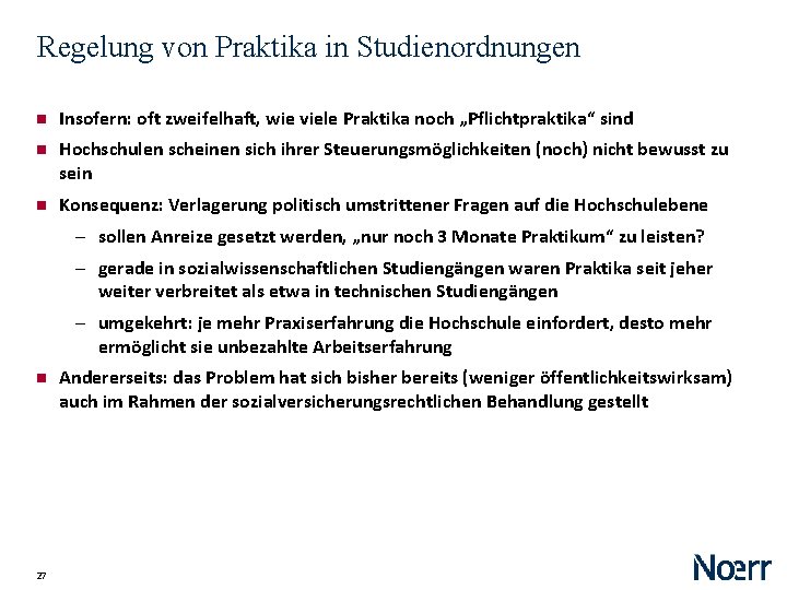 Regelung von Praktika in Studienordnungen Insofern: oft zweifelhaft, wie viele Praktika noch „Pflichtpraktika“ sind Hochschulen scheinen sich ihrer Steuerungsmöglichkeiten (noch) nicht bewusst zu sein Konsequenz: Verlagerung politisch umstrittener Fragen auf die Hochschulebene ‒ sollen Anreize gesetzt werden, „nur noch 3 Monate Praktikum“ zu leisten? ‒ gerade in sozialwissenschaftlichen Studiengängen waren Praktika seit jeher weiter verbreitet als etwa in technischen Studiengängen ‒ umgekehrt: je mehr Praxiserfahrung die Hochschule einfordert, desto mehr ermöglicht sie unbezahlte Arbeitserfahrung 27 Andererseits: das Problem hat sich bisher bereits (weniger öffentlichkeitswirksam) auch im Rahmen der sozialversicherungsrechtlichen Behandlung gestellt