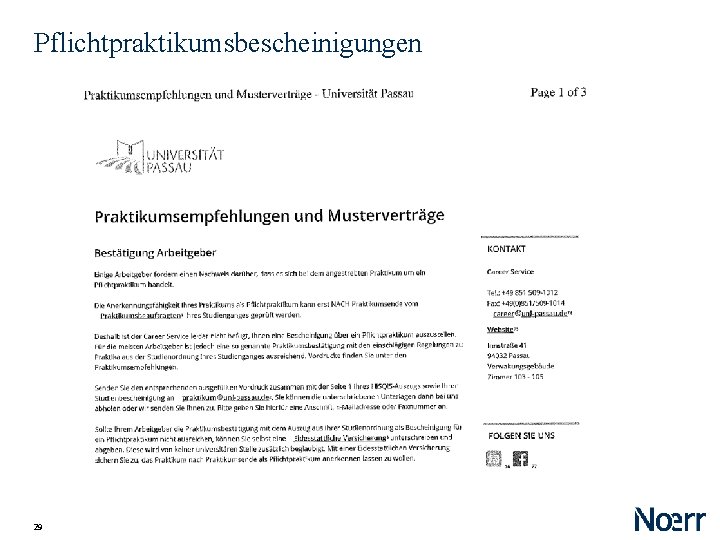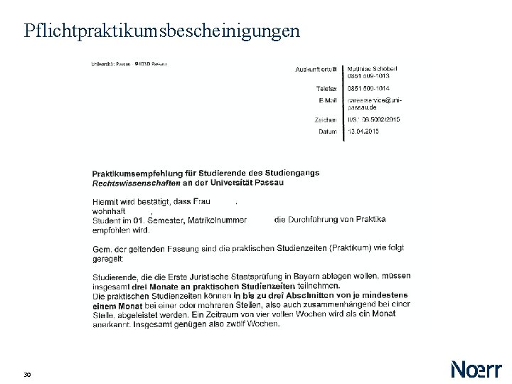 Pflichtpraktikumsbescheinigungen Ursprünglich kaum zu erlangen, inzwischen geht die Handhabung der Universitäten auseinander Rechtlich spannende Fragen: ‒ Vorgriff auf die Bewertung durch den Prüfer ‒ Haftung bei falscher Bescheinigung 28 Faktisch: erteilte Pflichtpraktikumsbescheinigung für Arbeitgeber ausreichend