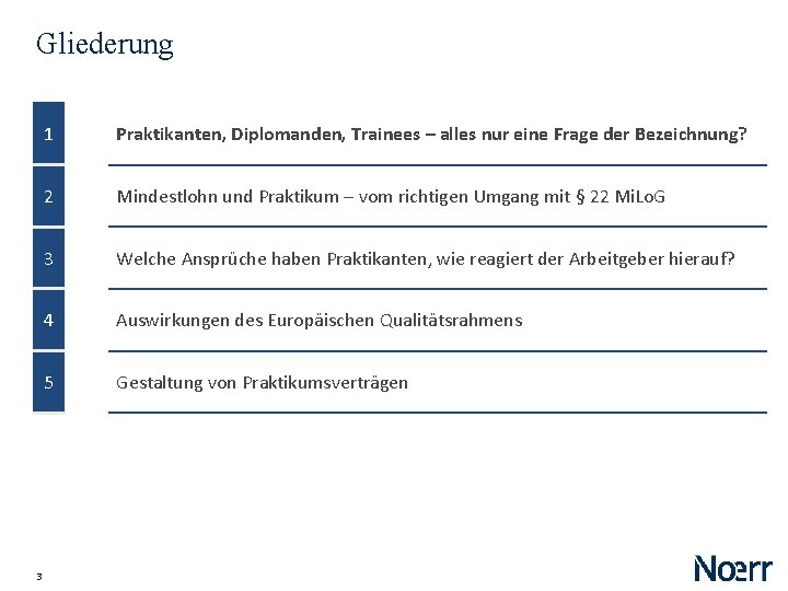 Gliederung 1 Praktikanten, Diplomanden, Trainees – alles nur eine Frage der Bezeichnung? 2 Mindestlohn und Praktikum – vom richtigen Umgang mit § 22 Mi. Lo. G 3 Welche Ansprüche haben Praktikanten, wie reagiert der Arbeitgeber hierauf? 4 Auswirkungen des Europäischen Qualitätsrahmens 5 Gestaltung von Praktikumsverträgen 10