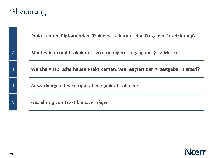 Gliederung 1 Praktikanten, Diplomanden, Trainees – alles nur eine Frage der Bezeichnung? 2 Mindestlohn und Praktikum – vom richtigen Umgang mit § 22 Mi. Lo. G 3 Welche Ansprüche haben Praktikanten, wie reagiert der Arbeitgeber hierauf? 4 Auswirkungen des Europäischen Qualitätsrahmens 5 Gestaltung von Praktikumsverträgen 33