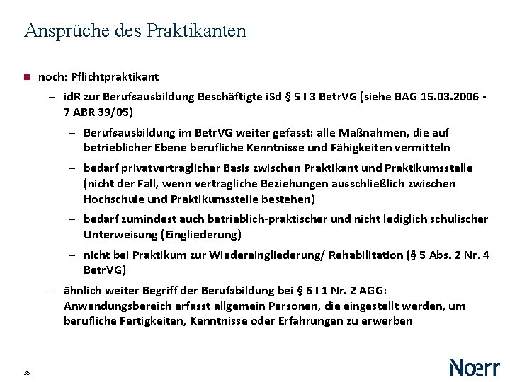 Ansprüche des Praktikanten Pflichtpraktikant ‒ Kein Vergütungsanspruch ‒ kein Urlaub, keine Entgeltfortzahlung ‒ „Kündigungsschutz“? ‒ Kein Anspruch auf qualifiziertes Zeugnis, Pflicht aber ggf nach Vereinbarung mit Hochschule ‒ Arbeitsschutz, also Arb. ZG, ASi. G, etc… ‒ wohl auch Verschwiegenheit (§ 26 BBi. G (-) § 13 S. 2 Nr. 6 BBi. G nicht unmittelbar anwendbar) ‒ Grundsätze der Arbeitnehmerhaftung gelten (Pallasch, Rd. A 2013, 338, 347; BAG 14. 10. 1993 - 8 AZR 242/92) 34