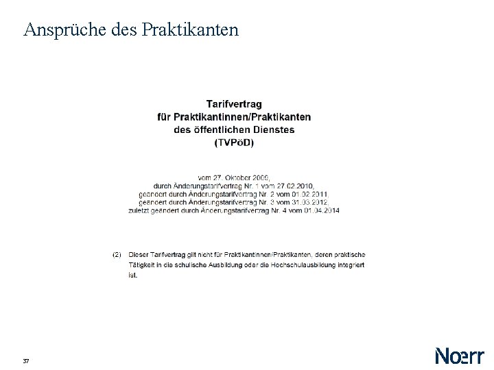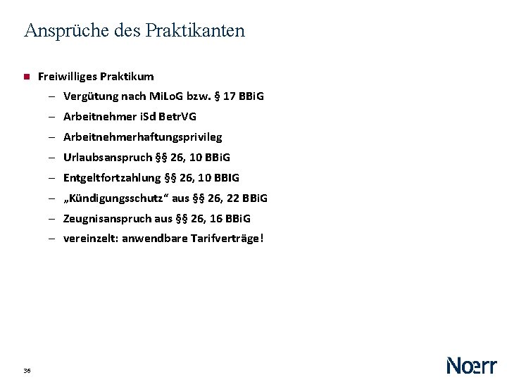 Ansprüche des Praktikanten Freiwilliges Praktikum ‒ Vergütung nach Mi. Lo. G bzw. § 17 BBi. G ‒ Arbeitnehmer i. Sd Betr. VG ‒ Arbeitnehmerhaftungsprivileg ‒ Urlaubsanspruch §§ 26, 10 BBi. G ‒ Entgeltfortzahlung §§ 26, 10 BBIG ‒ „Kündigungsschutz“ aus §§ 26, 22 BBi. G ‒ Zeugnisanspruch aus §§ 26, 16 BBi. G ‒ vereinzelt: anwendbare Tarifverträge! 36