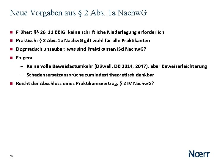 Neue Vorgaben aus § 2 Abs. 1 a Nachw. G § 2 Nachweispflicht „[…] (1 a) Wer einen Praktikanten einstellt, hat unverzüglich nach Abschluss des Praktikumsvertrages, spätestens vor Aufnahme der Praktikantentätigkeit, die wesentlichen Vertragsbedingungen schriftlich niederzulegen, die Niederschrift zu unterzeichnen und dem Praktikanten auszuhändigen. In die Niederschrift sind mindestens aufzunehmen: 1. der Name und die Anschrift der Vertragsparteien, 2. die mit dem Praktikum verfolgten Lern- und Ausbildungsziele, 3. Beginn und Dauer des Praktikums, 4. Dauer der regelmäßigen täglichen Praktikumszeit, 5. Zahlung und Höhe der Vergütung, 6. Dauer des Urlaubs, 7. ein in allgemeiner Form gehaltener Hinweis auf die Tarifverträge, Betriebs- oder Dienstvereinbarungen, die auf das Praktikumsverhältnis anzuwenden sind. Absatz 1 Satz 3 gilt entsprechend. […] (4) Wenn dem Arbeitnehmer ein schriftlicher Arbeitsvertrag ausgehändigt worden ist, entfällt die Verpflichtung nach den Absätzen 1 und 2, soweit der Vertrag die in den Absätzen 1 bis 3 geforderten Angaben enthält. “ 38