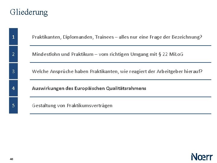 Gliederung 1 Praktikanten, Diplomanden, Trainees – alles nur eine Frage der Bezeichnung? 2 Mindestlohn und Praktikum – vom richtigen Umgang mit § 22 Mi. Lo. G 3 Welche Ansprüche haben Praktikanten, wie reagiert der Arbeitgeber hierauf? 4 Auswirkungen des Europäischen Qualitätsrahmens 5 Gestaltung von Praktikumsverträgen 40