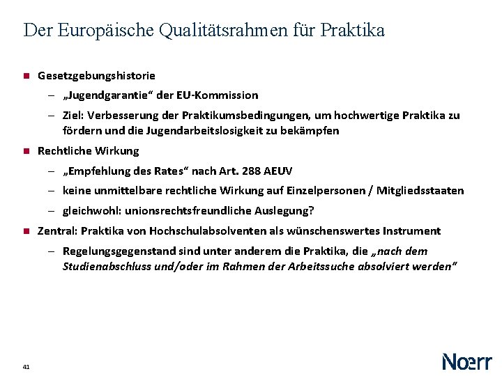 Der Europäische Qualitätsrahmen für Praktika Gesetzgebungshistorie ‒ „Jugendgarantie“ der EU-Kommission ‒ Ziel: Verbesserung der Praktikumsbedingungen, um hochwertige Praktika zu fördern und die Jugendarbeitslosigkeit zu bekämpfen Rechtliche Wirkung ‒ „Empfehlung des Rates“ nach Art. 288 AEUV ‒ keine unmittelbare rechtliche Wirkung auf Einzelpersonen / Mitgliedsstaaten ‒ gleichwohl: unionsrechtsfreundliche Auslegung? Zentral: Praktika von Hochschulabsolventen als wünschenswertes Instrument ‒ Regelungsgegenstand sind unter anderem die Praktika, die „nach dem Studienabschluss und/oder im Rahmen der Arbeitssuche absolviert werden“ 41