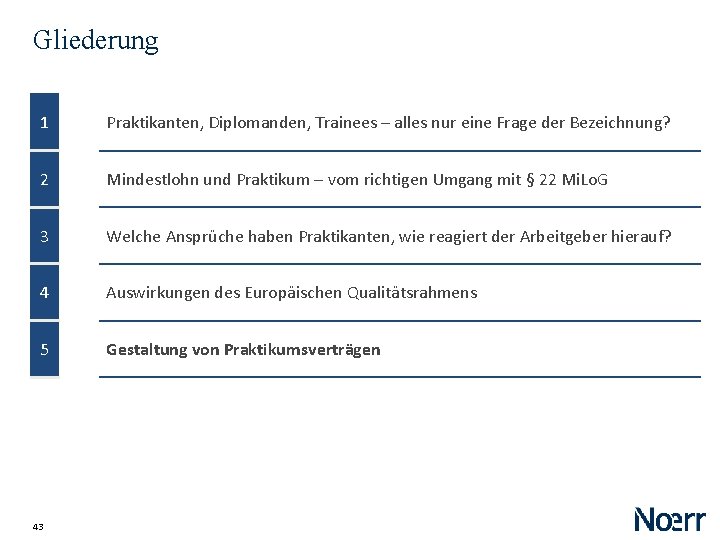 Der Europäische Qualitätsrahmen für Praktika Formelle Vorgaben ‒ Schriftliche Praktikumsvereinbarung ‒ Festlegung der Rechte + Pflichten ‒ etwaige Bezahlung ‒ Anerkennung durch „Bescheinigung oder Empfehlungsschreiben“ Materielle Vorgaben ‒ kaum materielle Vorgaben, insbesondere keine Vorgabe, dass Praktika stets vergütet werden sollen ‒ „angemessene Länge“, maximal 6 Monate, länger lediglich bei grenzüberschreitenden Sachverhalten ‒ Ansatz: Qualitätssicherung durch Transparenz Umsetzung: § 2 Abs. 1 a Nachw. G weiterführend: Vielmeier, BB 2014, 2485 42