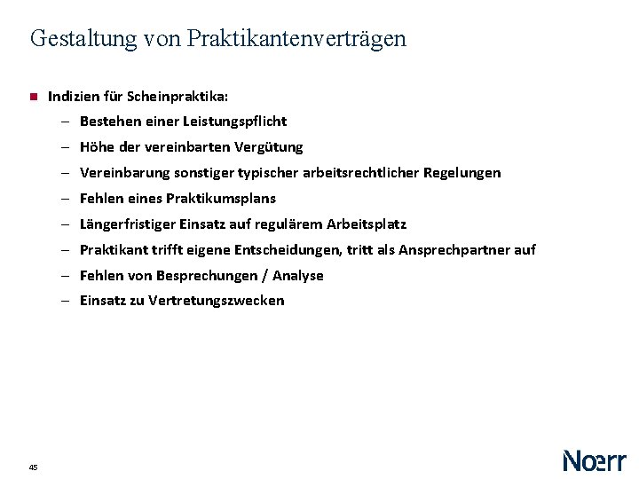 Gestaltung von Praktikantenverträgen Sollte davon abhängen, wer eingestellt wird ‒ Schüler / Pflichtpraktikant oder ‒ Vergüteter Praktikant nach Studium Materielle Vorgaben ‒ Klarstellung, dass keine Arbeitsleistung geschuldet (Wahl der Begrifflichkeiten) ‒ vor allem bei Praktika mit Absolventen: spezifischer Ausbildungsplan ‒ Aufnahme des Zwecks des Praktikums ‒ auflösende Bedingung ‒ Vertragsniederschrift beachten, § 2 Ia Nachw. G Umsetzung? ‒ geht natürlich schon in der Bewerbung los (HR-Interesse vs. AR-Interesse) 44
