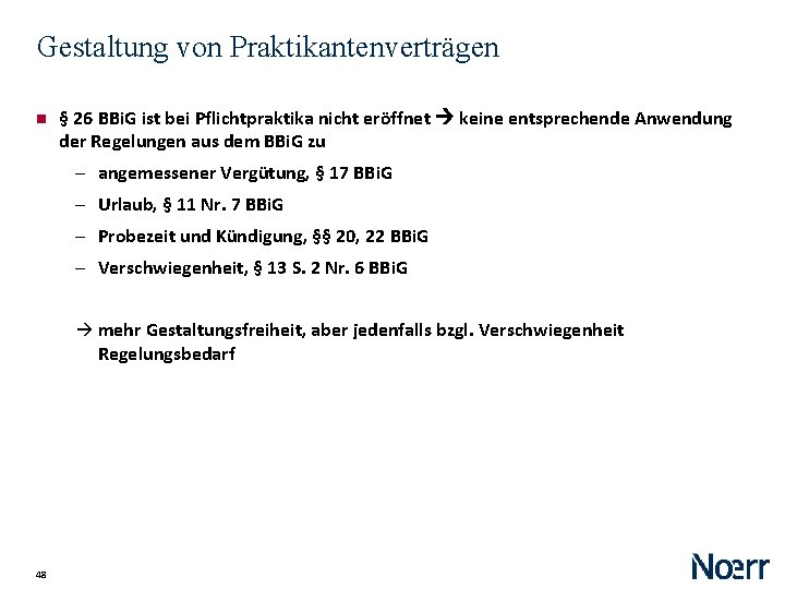 Gestaltung von Praktikantenverträgen § 26 BBi. G ist bei Pflichtpraktika nicht eröffnet keine entsprechende Anwendung der Regelungen aus dem BBi. G zu ‒ angemessener Vergütung, § 17 BBi. G ‒ Urlaub, § 11 Nr. 7 BBi. G ‒ Probezeit und Kündigung, §§ 20, 22 BBi. G ‒ Verschwiegenheit, § 13 S. 2 Nr. 6 BBi. G à mehr Gestaltungsfreiheit, aber jedenfalls bzgl. Verschwiegenheit Regelungsbedarf 48