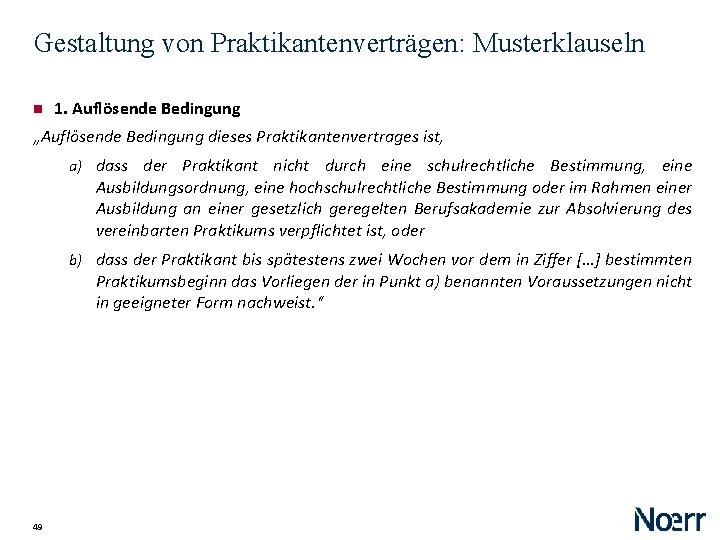 Gestaltung von Praktikantenverträgen: Musterklauseln 1. Auflösende Bedingung „Auflösende Bedingung dieses Praktikantenvertrages ist, a) dass der Praktikant nicht durch eine schulrechtliche Bestimmung, eine Ausbildungsordnung, eine hochschulrechtliche Bestimmung oder im Rahmen einer Ausbildung an einer gesetzlich geregelten Berufsakademie zur Absolvierung des vereinbarten Praktikums verpflichtet ist, oder b) dass der Praktikant bis spätestens zwei Wochen vor dem in Ziffer […] bestimmten Praktikumsbeginn das Vorliegen der in Punkt a) benannten Voraussetzungen nicht in geeigneter Form nachweist. “ 49