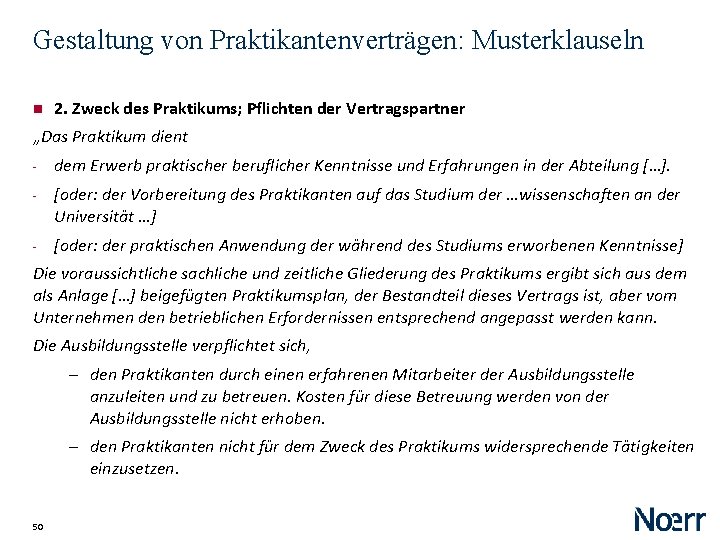 Gestaltung von Praktikantenverträgen: Musterklauseln 2. Zweck des Praktikums; Pflichten der Vertragspartner „Das Praktikum dient - dem Erwerb praktischer beruflicher Kenntnisse und Erfahrungen in der Abteilung […]. - [oder: der Vorbereitung des Praktikanten auf das Studium der …wissenschaften an der Universität …] - [oder: der praktischen Anwendung der während des Studiums erworbenen Kenntnisse] Die voraussichtliche sachliche und zeitliche Gliederung des Praktikums ergibt sich aus dem als Anlage […] beigefügten Praktikumsplan, der Bestandteil dieses Vertrags ist, aber vom Unternehmen den betrieblichen Erfordernissen entsprechend angepasst werden kann. Die Ausbildungsstelle verpflichtet sich, ‒ den Praktikanten durch einen erfahrenen Mitarbeiter der Ausbildungsstelle anzuleiten und zu betreuen. Kosten für diese Betreuung werden von der Ausbildungsstelle nicht erhoben. ‒ den Praktikanten nicht für dem Zweck des Praktikums widersprechende Tätigkeiten einzusetzen. 50