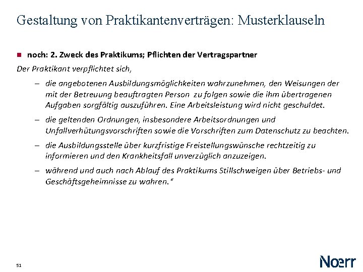 Gestaltung von Praktikantenverträgen: Musterklauseln noch: 2. Zweck des Praktikums; Pflichten der Vertragspartner Der Praktikant verpflichtet sich, ‒ die angebotenen Ausbildungsmöglichkeiten wahrzunehmen, den Weisungen der mit der Betreuung beauftragten Person zu folgen sowie die ihm übertragenen Aufgaben sorgfältig auszuführen. Eine Arbeitsleistung wird nicht geschuldet. ‒ die geltenden Ordnungen, insbesondere Arbeitsordnungen und Unfallverhütungsvorschriften sowie die Vorschriften zum Datenschutz zu beachten. ‒ die Ausbildungsstelle über kurzfristige Freistellungswünsche rechtzeitig zu informieren und den Krankheitsfall unverzüglich anzuzeigen. ‒ während und auch nach Ablauf des Praktikums Stillschweigen über Betriebs- und Geschäftsgeheimnisse zu wahren. “ 51