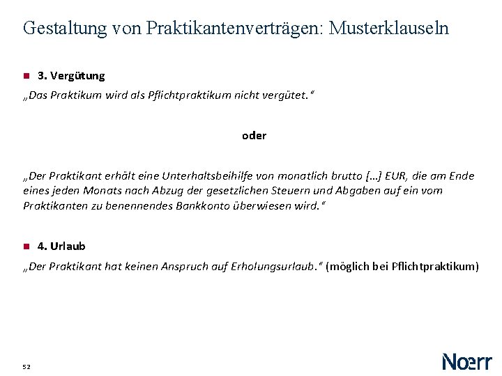 Gestaltung von Praktikantenverträgen: Musterklauseln 3. Vergütung „Das Praktikum wird als Pflichtpraktikum nicht vergütet. “ oder „Der Praktikant erhält eine Unterhaltsbeihilfe von monatlich brutto […] EUR, die am Ende eines jeden Monats nach Abzug der gesetzlichen Steuern und Abgaben auf ein vom Praktikanten zu benennendes Bankkonto überwiesen wird. “ 4. Urlaub „Der Praktikant hat keinen Anspruch auf Erholungsurlaub. “ (möglich bei Pflichtpraktikum) 52