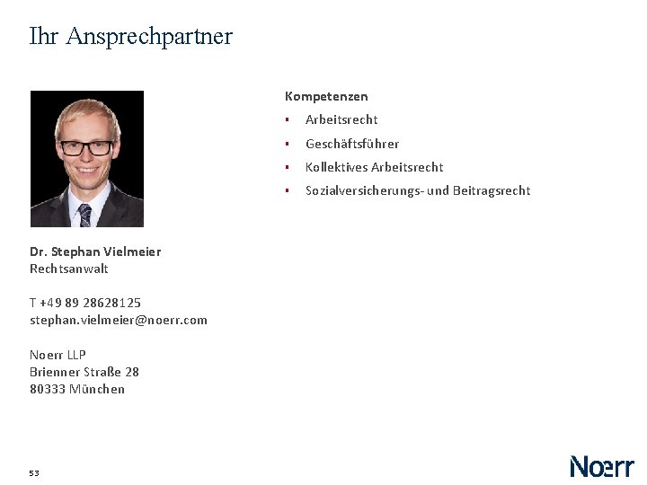 Ihr Ansprechpartner Kompetenzen Dr. Stephan Vielmeier Rechtsanwalt T +49 89 28628125 stephan. vielmeier@noerr. com Noerr LLP Brienner Straße 28 80333 München 53 § Arbeitsrecht § Geschäftsführer § Kollektives Arbeitsrecht § Sozialversicherungs- und Beitragsrecht