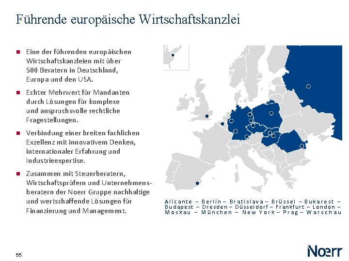 Führende europäische Wirtschaftskanzlei Eine der führenden europäischen Wirtschaftskanzleien mit über 500 Beratern in Deutschland, Europa und den USA. Echter Mehrwert für Mandanten durch Lösungen für komplexe und anspruchsvolle rechtliche Fragestellungen. Verbindung einer breiten fachlichen Exzellenz mit innovativem Denken, internationaler Erfahrung und Industrieexpertise. Zusammen mit Steuerberatern, Wirtschaftsprüfern und Unternehmensberatern der Noerr Gruppe nachhaltige und wertschaffende Lösungen für Finanzierung und Management. 55 A l i c a n t e – B e r l i n – B r a t i s l a v a – B r ü s s e l – B u k a r e s t – B u d a p e s t – D r e s d e n – D ü s s e l d o r f – F r a n k f u r t – L o n d o n – M o s k a u – M ü n c h e n – N e w Y o r k – P r a g – W a r s c h a u