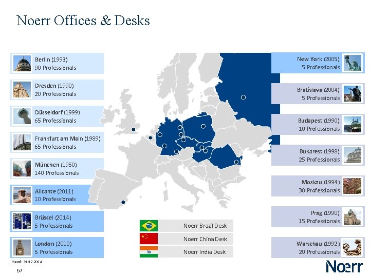 Noerr Offices & Desks New York (2005) 5 Professionals Berlin (1993) 90 Professionals Dresden (1990) 20 Professionals Bratislava (2004) 5 Professionals Düsseldorf (1999) 65 Professionals Budapest (1990) 10 Professionals Frankfurt am Main (1989) 65 Professionals Bukarest (1998) 25 Professionals München (1950) 140 Professionals Moskau (1994) 30 Professionals Alicante (2011) 10 Professionals Brüssel (2014) 5 Professionals London (2010) 5 Professionals Stand: 31. 12. 2014 57 Noerr Brazil Desk Noerr China Desk Noerr India Desk Prag (1990) 15 Professionals Warschau (1992) 20 Professionals