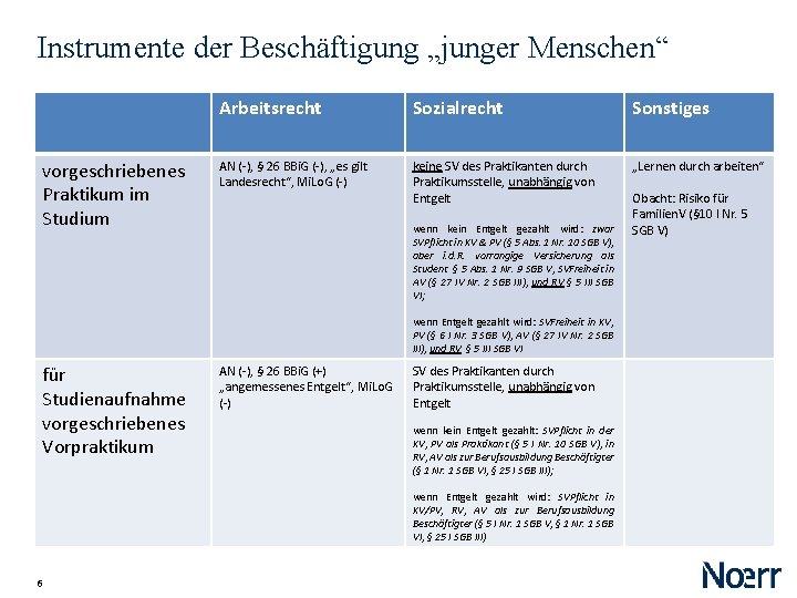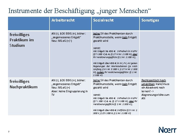 Instrumente der Beschäftigung „junger Menschen“ vorgeschriebenes Praktikum im Studium Arbeitsrecht Sozialrecht Sonstiges AN (-), § 26 BBi. G (-), „es gilt Landesrecht“, Mi. Lo. G (-) keine SV des Praktikanten durch Praktikumsstelle, unabhängig von Entgelt „Lernen durch arbeiten“ wenn kein Entgelt gezahlt wird: zwar SVPflicht in KV & PV (§ 5 Abs. 1 Nr. 10 SGB V), aber i. d. R. vorrangige Versicherung als Student § 5 Abs. 1 Nr. 9 SGB V, SVFreiheit in AV (§ 27 IV Nr. 2 SGB III), und RV § 5 III SGB VI; wenn Entgelt gezahlt wird: SVFreiheit in KV, PV (§ 6 I Nr. 3 SGB V), AV (§ 27 IV Nr. 2 SGB III), und RV § 5 III SGB VI für Studienaufnahme vorgeschriebenes Vorpraktikum AN (-), § 26 BBi. G (+) „angemessenes Entgelt“, Mi. Lo. G (-) SV des Praktikanten durch Praktikumsstelle, unabhängig von Entgelt wenn kein Entgelt gezahlt: SVPflicht in der KV, PV als Praktikant (§ 5 I Nr. 10 SGB V), in RV, AV als zur Berufsausbildung Beschäftigter (§ 1 Nr. 1 SGB VI, § 25 I SGB III); wenn Entgelt gezahlt wird: SVPflicht in KV/PV, RV, AV als zur Berufsausbildung Beschäftigter (§ 5 I Nr. 1 SGB V, § 1 Nr. 1 SGB VI, § 25 I SGB III) 6 Obacht: Risiko für Familien. V (§ 10 I Nr. 5 SGB V)