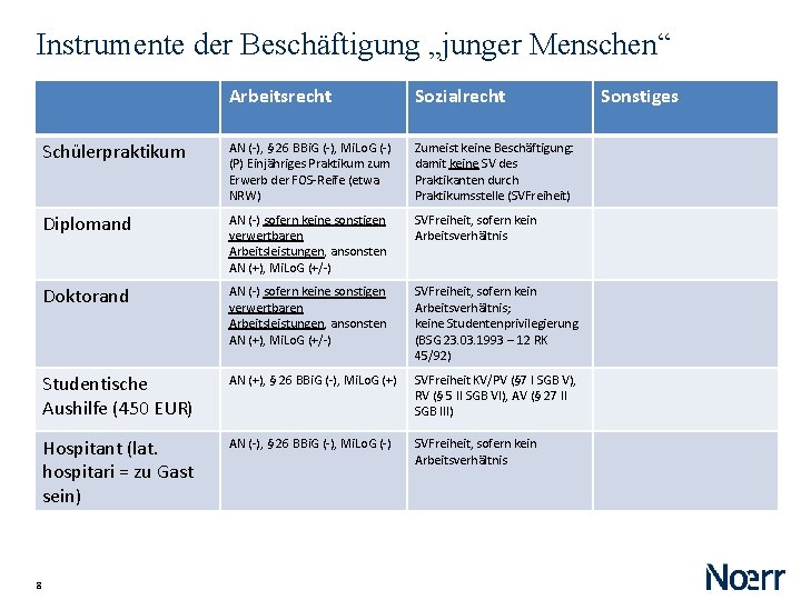 Instrumente der Beschäftigung „junger Menschen“ freiwilliges Praktikum im Studium Arbeitsrecht Sozialrecht AN (-), § 26 BBi. G (+), bisher: „angemessenes Entgelt“ Neu: Mi. Lo. G (+/-) keine SV des Praktikanten durch Praktikumsstelle, wenn kein Entgelt gezahlt wird Sonstiges sonst: mit Entgelt bis 450 €: SVFreiheit in KV/PV (§ 7 I SGB V) & AL (§ 27 IV Nr. 2 SGB III), aber RV Versicherungspflicht (§ 1 Nr. 1 SGB VI); mit Entgelt über 450 €: in KV, PV, AV gelten Regelungen der Werkstudenten (je nach Umfang, § 6 I Nr. 3 SGB V, § 27 IV Nr. 2 SGB III), zudem RV Versicherungspflicht (§ 1 Nr. 1 SGB VI) freiwilliges Nachpraktikum AN (-), § 26 BBi. G (+), bisher: „angemessenes Entgelt“ Neu: Mi. Lo. G (+) Aber: keine Eingruppierung in TV keine SV des Praktikanten durch Praktikumsstelle, wenn kein Entgelt gezahlt wird sonst: mit Entgelt bis 450 €: SVFreiheit in KV/PV (§ 7 I SGB V) & AL (§ 27 II SGB III), aber RV Versicherungspflicht (§ 1 Nr. 1 SGB VI); mit Entgelt über 450 €: SVPflicht (§ 5 I Nr. 1 SGB V, § 25 I SGB III, § 1 Nr. 1 SGB VI) 7 Rechtspoltisch hoch umstritten: kann/muss ein Absolvent noch lernen? -> Abgrenzungsrisiko zum AN