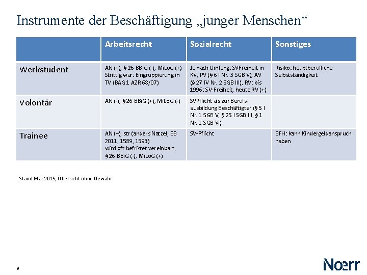 Instrumente der Beschäftigung „junger Menschen“ 8 Arbeitsrecht Sozialrecht Schülerpraktikum AN (-), § 26 BBi. G (-), Mi. Lo. G (-) (P) Einjähriges Praktikum zum Erwerb der FOS-Reife (etwa NRW) Zumeist keine Beschäftigung: damit keine SV des Praktikanten durch Praktikumsstelle (SVFreiheit) Diplomand AN (-) sofern keine sonstigen verwertbaren Arbeitsleistungen, ansonsten AN (+), Mi. Lo. G (+/-) SVFreiheit, sofern kein Arbeitsverhältnis Doktorand AN (-) sofern keine sonstigen verwertbaren Arbeitsleistungen, ansonsten AN (+), Mi. Lo. G (+/-) SVFreiheit, sofern kein Arbeitsverhältnis; keine Studentenprivilegierung (BSG 23. 03. 1993 – 12 RK 45/92) Studentische Aushilfe (450 EUR) AN (+), § 26 BBi. G (-), Mi. Lo. G (+) SVFreiheit KV/PV (§ 7 I SGB V), RV (§ 5 II SGB VI), AV (§ 27 II SGB III) Hospitant (lat. hospitari = zu Gast sein) AN (-), § 26 BBi. G (-), Mi. Lo. G (-) SVFreiheit, sofern kein Arbeitsverhältnis Sonstiges