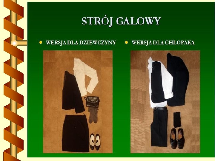 noszenie stroju galowego w czasie uroczystości szkolnych; strój galowy składa się z białej bluzki/koszuli oraz czarnej lub granatowej spódnicy/spodni zmienianie obuwia w szatni na obuwie zamienne noszone w szkole