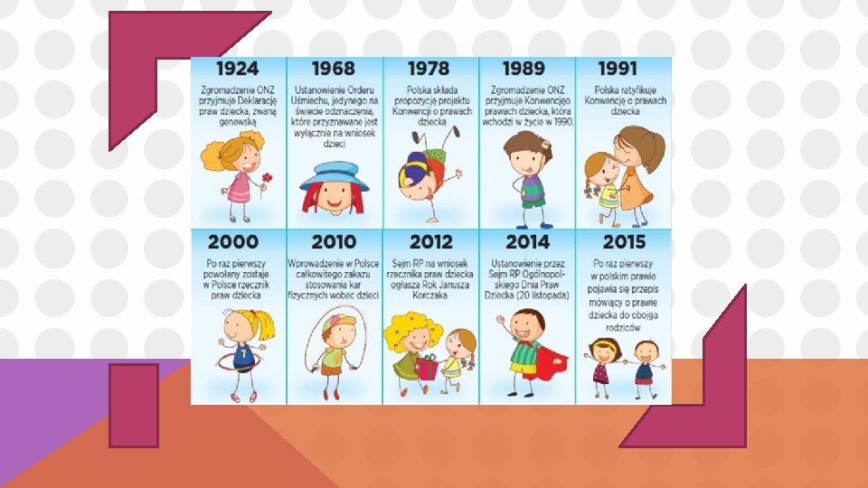 PIERWSZYM DOKUMENTEM MIĘDZYNARODOWYM, KTÓRY OKREŚLAŁ PRAWA DZIECKA BYŁA GENEWSKA DEKLARACJA PRAW DZIECKA STWORZONA W 1924 ROKU PRZEZ MIĘDZYNARODOWY ZWIĄZEK POMOCY DZIECIOM, A NASTĘPNIE PRZYJĘTA PRZEZ LIGĘ NARODÓW. PO II WOJNIE ŚWIATOWEJ PRAWAMI DZIECKA ZAJĘŁA SIĘ ORGANIZACJA NARODÓW ZJEDNOCZONYCH. W 1959 ROKU ZGROMADZENIE OGÓLNE ONZ UCHWALIŁO DEKLARACJĘ PRAW DZIECKA, W KTÓREJ WYRAŹNIE POSZERZONO KATALOG PRAW PRZYSŁUGUJĄCYCH DZIECIOM NA CAŁYM ŚWIECIE.